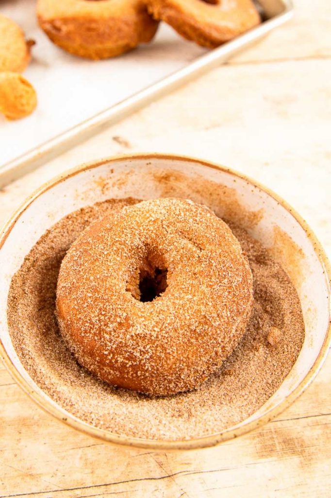 4. Coat – Cool the cake donuts slightly on a paper towel-lined plate, and roll them in the cinnamon sugar mixture while warm. Enjoy!
