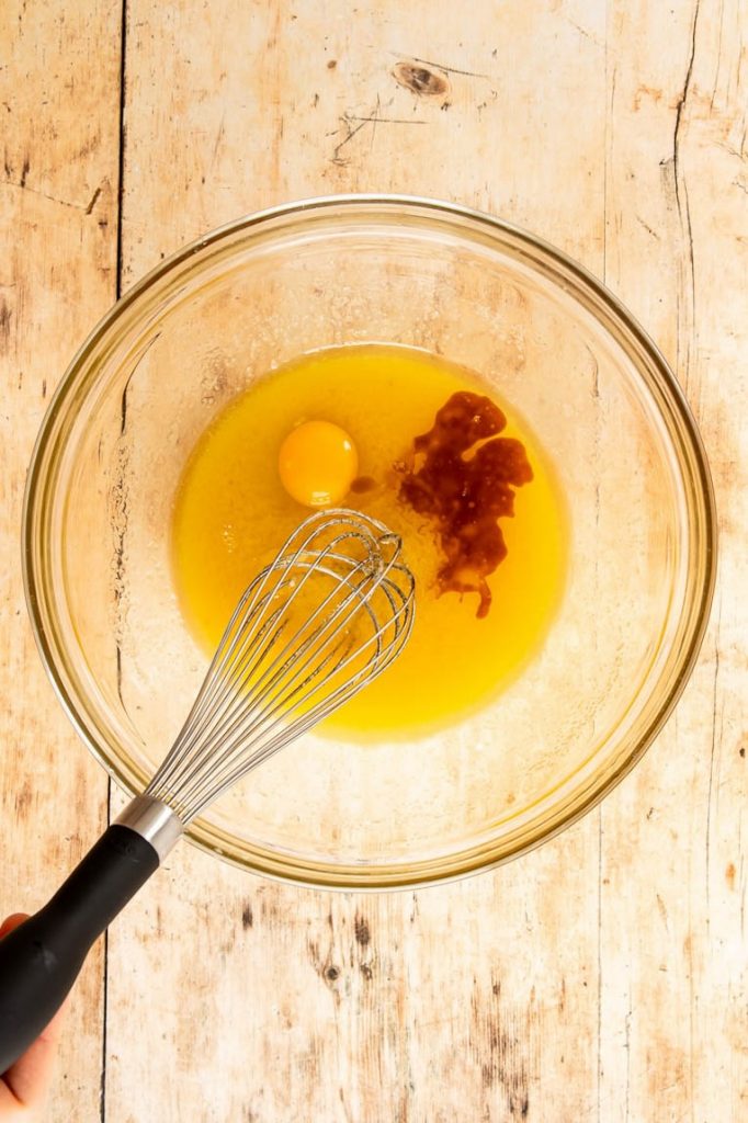 - Combine the wet ingredients – Whisk the melted butter, granulated sugar, and brown sugar in a large bowl. Then, whisk in the vanilla and egg until smooth.