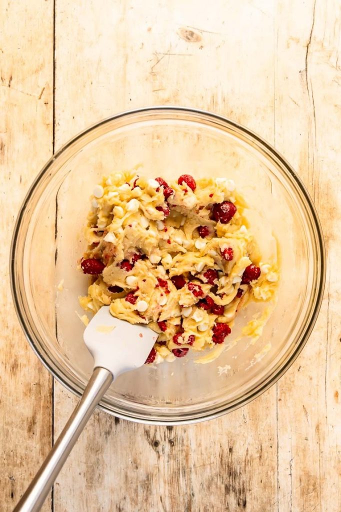 This recipe must be chilled before baking. So, we recommend reading through the steps before you begin and planning accordingly. You’ll need two mixing bowls, two large baking sheets, and a large cookie scoop. Here’s how to make soft White Chocolate Raspberry Cookies: