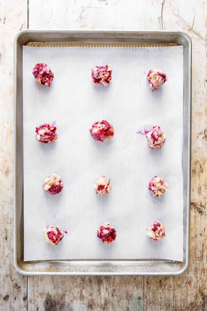 - When using frozen raspberries, be sure to choose the whole raspberries within the bag. Many times, the bag of frozen raspberries will be filled with fragments of broken raspberries. Try to avoid the little raspberry pieces and only choose whole raspberries so that they will hold their shape in the cookies and be less likely to dye the cookie dough.